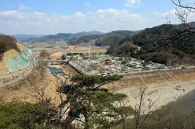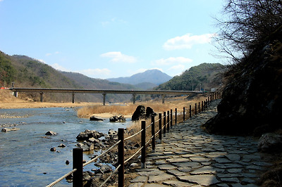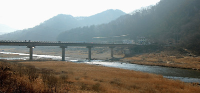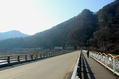 머리를 숙여 지나야 하는 철판길이 있는 홍천강변의 길을 따라..