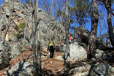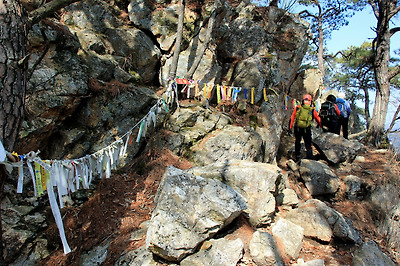 경사가 있는 육산의 등로에 이어 거친 바위가 있는 바윗길을 따른다.