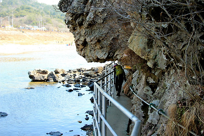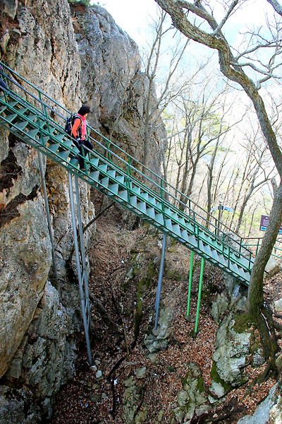 거칠고 까칠한 바위구간에는 나무계단이 나있다.