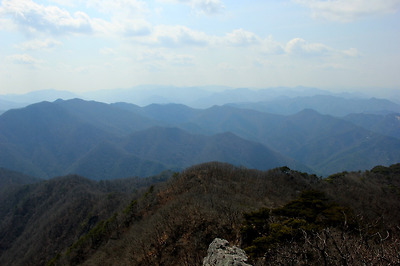 남군자산으로 이어진 능선을 조망하고 오른쪽 멀리 속리산이 조망되어..