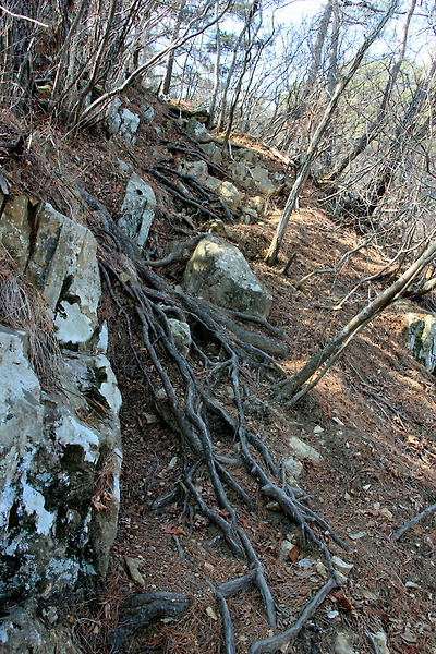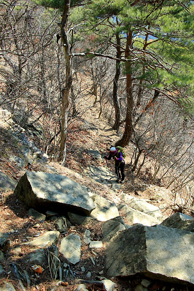 봉우리를 넘어 까칠해진 등로를 내려와..