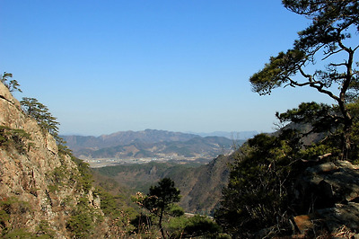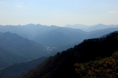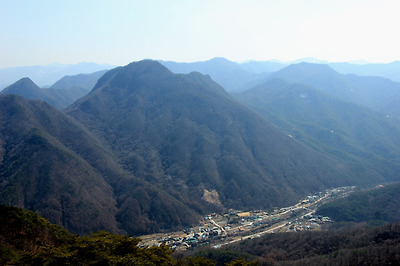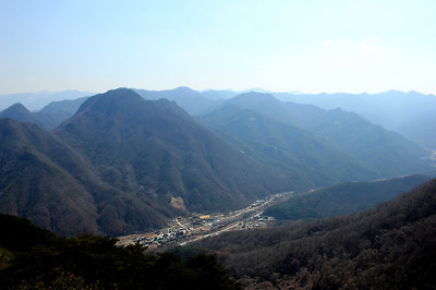 아래로 쌍곡계곡의 도로가 보이고 멀리 성불산이 바라보인다.