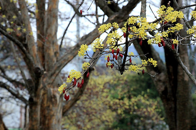 산수유 열매를 맺힌채 꽃을 피운 산수유나무..