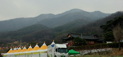 아직 개점하지 않은 천막 뒤로 영축사가 바라보이고 멀리 원적산이 우뚝 서있다.