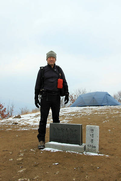 정상에서 밤을 보낸 백패커가 정상석과 함께 사진을 담아준다.