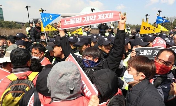 민주노총은 3일 국회 환경노동위원회가 탄력근로제 확대를 위한 근로기준법 개정안을 논의하기로 하자 이날 오전부터 국회 진입을 시도하며 경찰과 충돌했다.