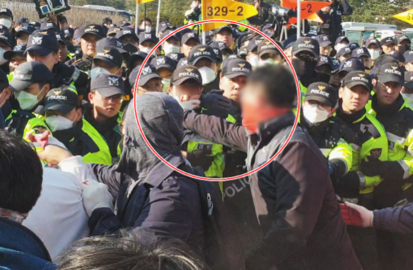 3일 오후 한 민주노총 조합원이 국회 진입을 막고 있는 경찰의 뺨을 때리고 있다. /최상현 기자
