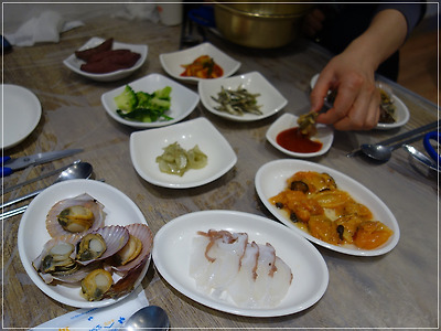 밑만찬과 서비스로 맛보기용 수산물이 나온다.