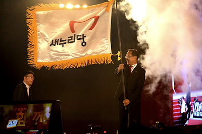 ▲ 대선 후보자로 박근혜가 지명됐던 2012년 8월 새누리당 2차 전당대회에서 황우여 원내대표가 새누리당기를 흔들고 있다. 사진=이치열 기자