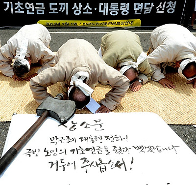 ‘빈곤노인 기초연금 보장 연대’ 관계자들이 서울 청운효자동주민센터 앞에서 기초생활보장 수급 노인들의 기초연금 수여를 요구하는