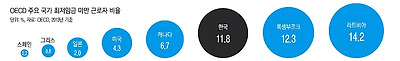 저임금을 줄이고 노동자 처우를 개선하려고 도입한 최저임금제는 제대로 작동하지 않는다. 내년도 법정 최저임금은 시간당 6470원으로 올해보다 440원(7.3%) 인상됐다. 한 달 임금으로 환산하면 135만2230원. 1인 가구의 월평균 생계비(167만3803원)에도 못 미친다. 이마저도 잘 지켜지지 않는다. 한국에서 최저임금도 못 받는 ‘근로자 비율’은 11.8%(2013년 기준)다. OECD 26개국 중 세 번째로 높다.