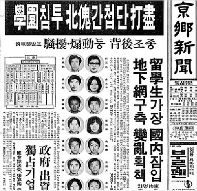 ▲ 김기춘 대공수사국장이 발표한 '학원침투 북괴간첩단' 사건 관련 기사(경향신문 1975년 11월 22일자 1면) ⓒ 경향신문