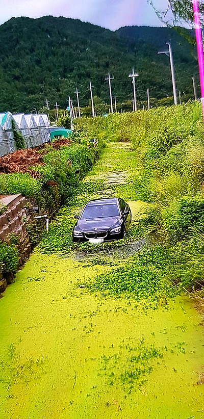 농로를 달리던 중 먼산 보고 가다가 수로에 빠졌답니다.
