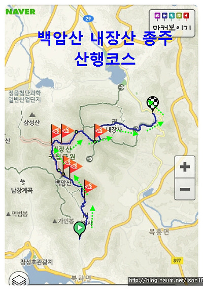 코스 : 백양사주차장~백양사~약사암~영천굴~백학봉~백암산 상왕봉~순장새재~소둥근재~까치봉삼거리~내장산 신선봉~신선봉삼거리~내장사~주차장