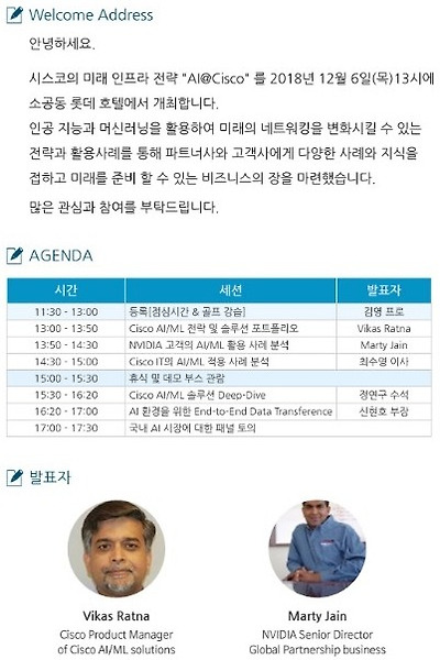 시스코코리아는 12월 6일 롯데호텔서울 2층 크리스탈볼룸에서 AI@Cisco 세미나를 개최합니다.