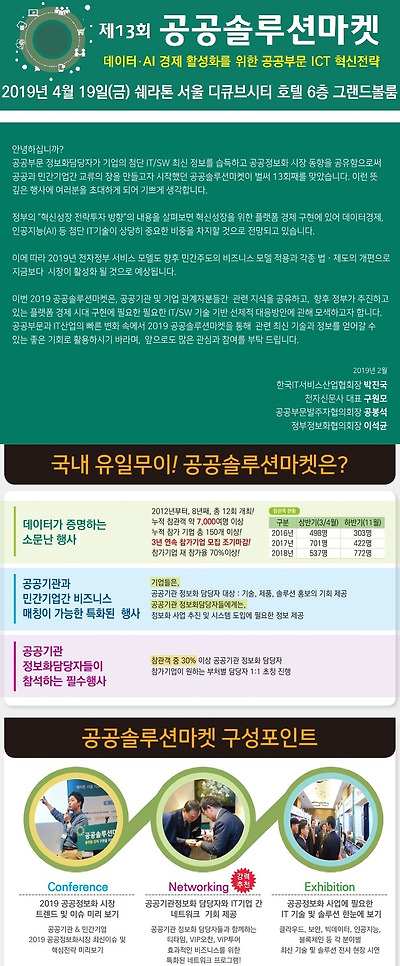 이번 2019 공공솔루션마켓은, 공공기관 및 기업 관계자분들간 관련 지식을 공유하고, 향후 정부가 추진하고 있는 플랫폼 경제 시대 구현에 필요한 IT/SW 기술 기반 선제적 대응방안에 관해 모색하고자 합니다. 공공부문과 IT산업의 빠른 변화 속에서 2019 공공솔루션마켓을 통해 관련 최신 기술과 정보를 얻어갈 수 있는 좋은 기회로 활용하시기 바라며, 앞으로도 많은 관심과 참여를 부탁드립니다.