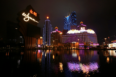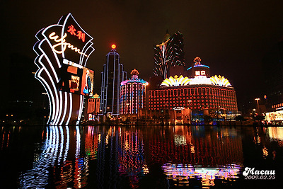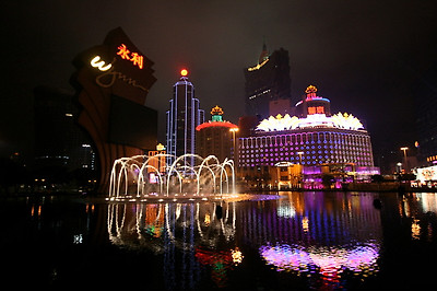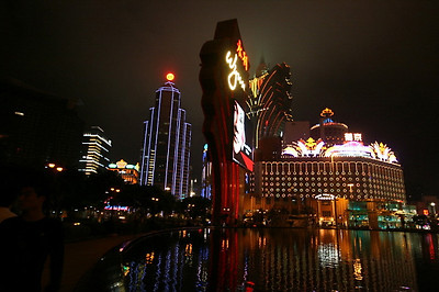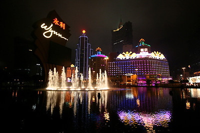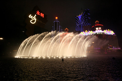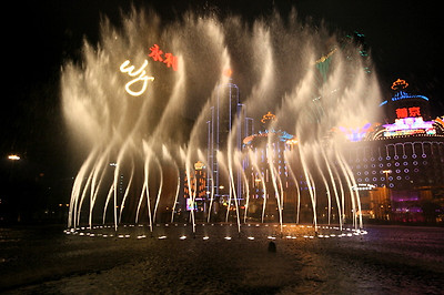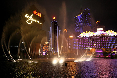 윈호텔 정문에서 바라본 분수대와 분수대 건너편의 리스보아 호텔