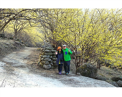 돌담과 산수유를 배경으로 기념 사진도 남깁니다.