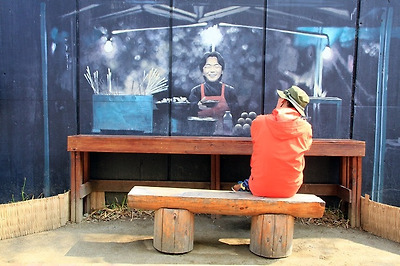 중간 중간 벽화를 배경으로 사진을 찍을 수 있게 의자를 놓아 둔 점이 맘에 드네요.