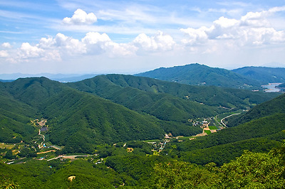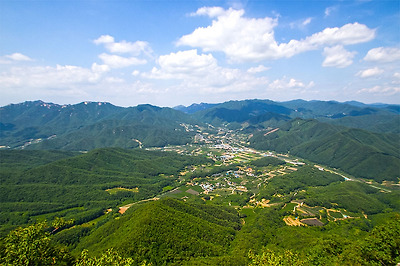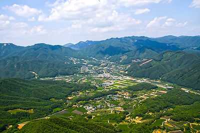 황장산, 도솔봉, 그리고 높은 산에 둘러싸인 동로면 소재지의 모습이 보이네요.