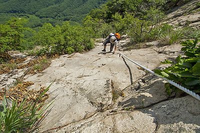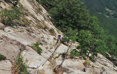슬랩 사면을 오르면 로프가 슬랩 좌측으로 우회했다가 재차 우측으로 방향을 틀면서 슬랩 상단 지점으로 이어지고...