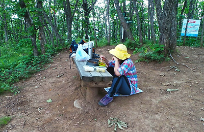 정상에서 도시락을 펼칠 수도 있겠지만 벤치도 있어 밥 먹기에 적격인 장소 같아 5시에 늦은 점심(?)을 먹습니다.