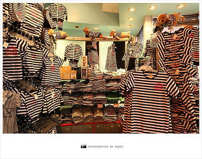 남녀노소, 게다가 강아지 옷까지 알카트래즈 갑옥의 죄수복을 연상케 하는 줄무늬로 만들어 진열해 놓은 것이 재미있다.