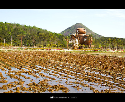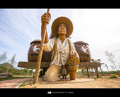 16m 높이의 건물은 지게의 끈과 농부의 표정까지 디테일이 살아있으며, 농부가 지게에 항아리를 진 모습으로 건물을 지은 이유는