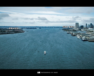 샌디에이고 다운타운을 벗어나 코로나도 다리를 건너기 시작했을 때 버스에서 찍은 사진이예요.
