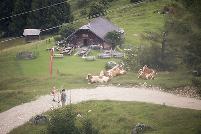 중간쯤 되는 지점에 하이킹족들을 위한 쉼터(휴게소)가 있고 주변으로 휴식을 취하고 있는 소들이 내려다 보입니다.