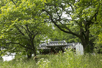 우물 뒤쪽으로 언덕에 세워져 있는 사당이 하나 보이고...