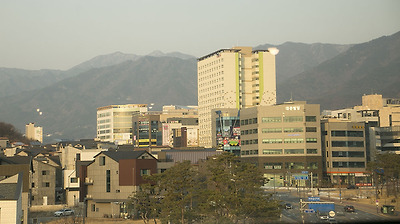 창 밖으로 보이는 치악산을 바라보며 음식 대신 짝꿍의 사랑으로 마음을 부르게 하고