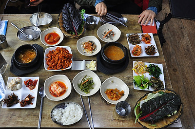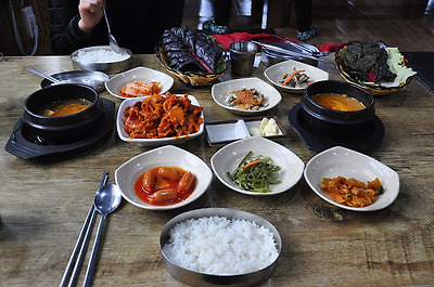 얼마 후 기본 반찬과 쌈, 청국장과 된장찌개, 그리고 밥이 차려졌는데