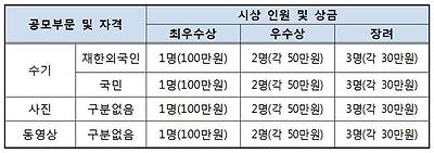 3개 부문별 시상내역은 아래와 같으며, 최우수상, 우수상 수상자에게는 소정의 상금과 법무부장관 상장이 수여됩니다.