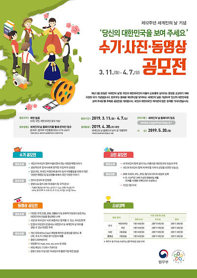 법무부는 세계인의 날을 기념하기 위해 「당신의 대한민국을 보여주세요」라는 주제로 수기와 사진, 동영상 공모전을 개최합니다.