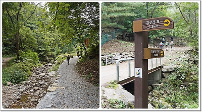 등산안내도와 벤치가 있는 쉼터를 지나자