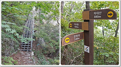마대산 440m 이정표와 짧은 밧줄 구간