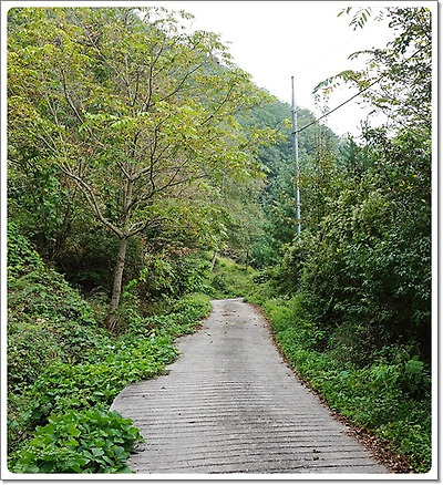 더 하산하자 시멘트 포장 임도에 내려섰다.