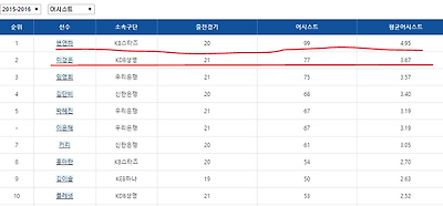 현재 어시스트가 변연하 99개, 이경은 77개로