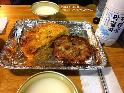 마린마크포 코스가 있습니다. 순희네빈대떡집에서 간단히 녹두전 고기전 하나씩에 막걸리 2잔씩 먹고 자매네 육회집에서 육회하나에 소주 2병