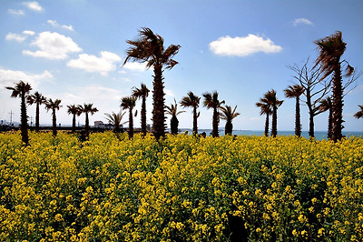 해변 따라, 해변 위 언덕길을 꽉 메우고 있는 유채꽃과 종려나무의 어울어짐이 참 아름답다.