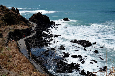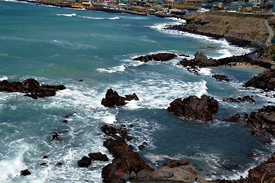 에메랄드빛 바다, 거센 파도가 해변가 현무암 지대를 사정 없이 내리치며 내는 굉음을 음악소리 삼아