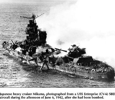 미 해군 급강하 폭격기의 폭탄 세례를 받고 대파된 일본 해군의 중순양함 미쿠마 - 1942년 6월 6일