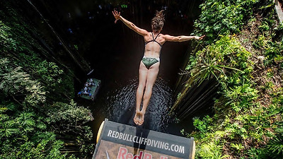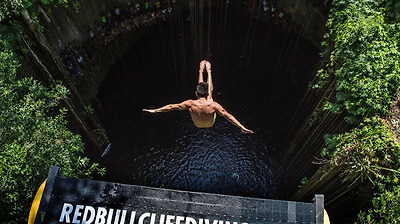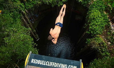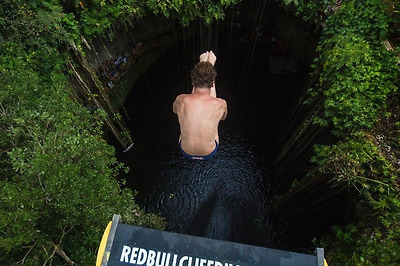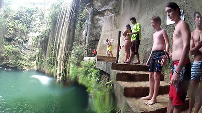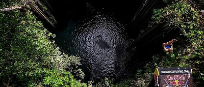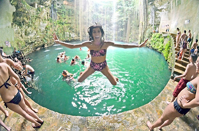 멕시코 유카탄 반도 칸쿤 지역 치첸 이사 근처 익킬 세노테 위에서의 절벽 다이빙 -2014년 10월 16일