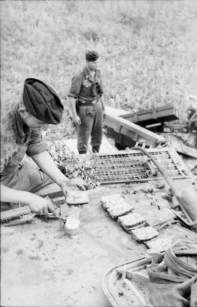 포탄 보급 작업을 마친 후 점심으로 샌드위치 6인분을 만드는 123번 타이거-1 전차의 독일군 전차 승무원