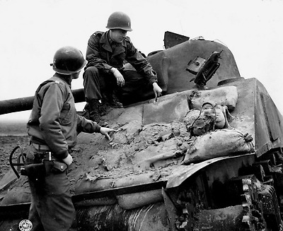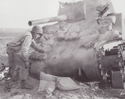 제 2차 세계대전 말기 독일 본토에서 판저 파우스트에 파괴된 전면 장갑 샌드백 보강 미군 M 4 셔먼 전차- 1945년 3월