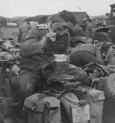 BMW R 75 모터 사이클에 앉아 반합 식사를 하는 독일군 장교