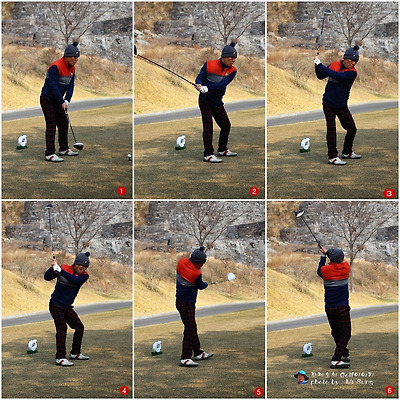 성 프로가 드라이버를 잡고 실제로 티샷을 날리는 장면을 고속으로 연속촬영한 멋진 폼의 자세다.