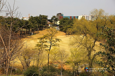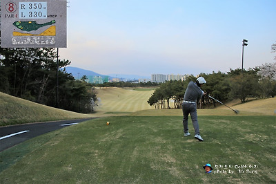 45년간의 역사와 전통을 자랑하는 명문구장으로 불리는 대구칸트리구락부라는 표지판의 뒤로는 벚꽃이 만발하여