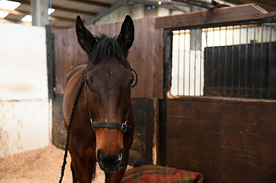 이 말은 고삐에 의해서만 픽업에 고정되어 있으면서 위험한